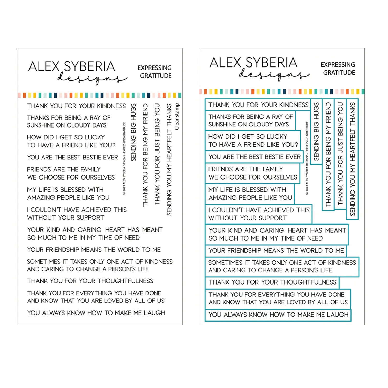 This one-piece stamp features 17 sentiments that stamp all at once, saving you time and effort. Pair it with the Expressing Gratitude Sentiments Die to cut them all in one pass — quick, easy, and efficient!