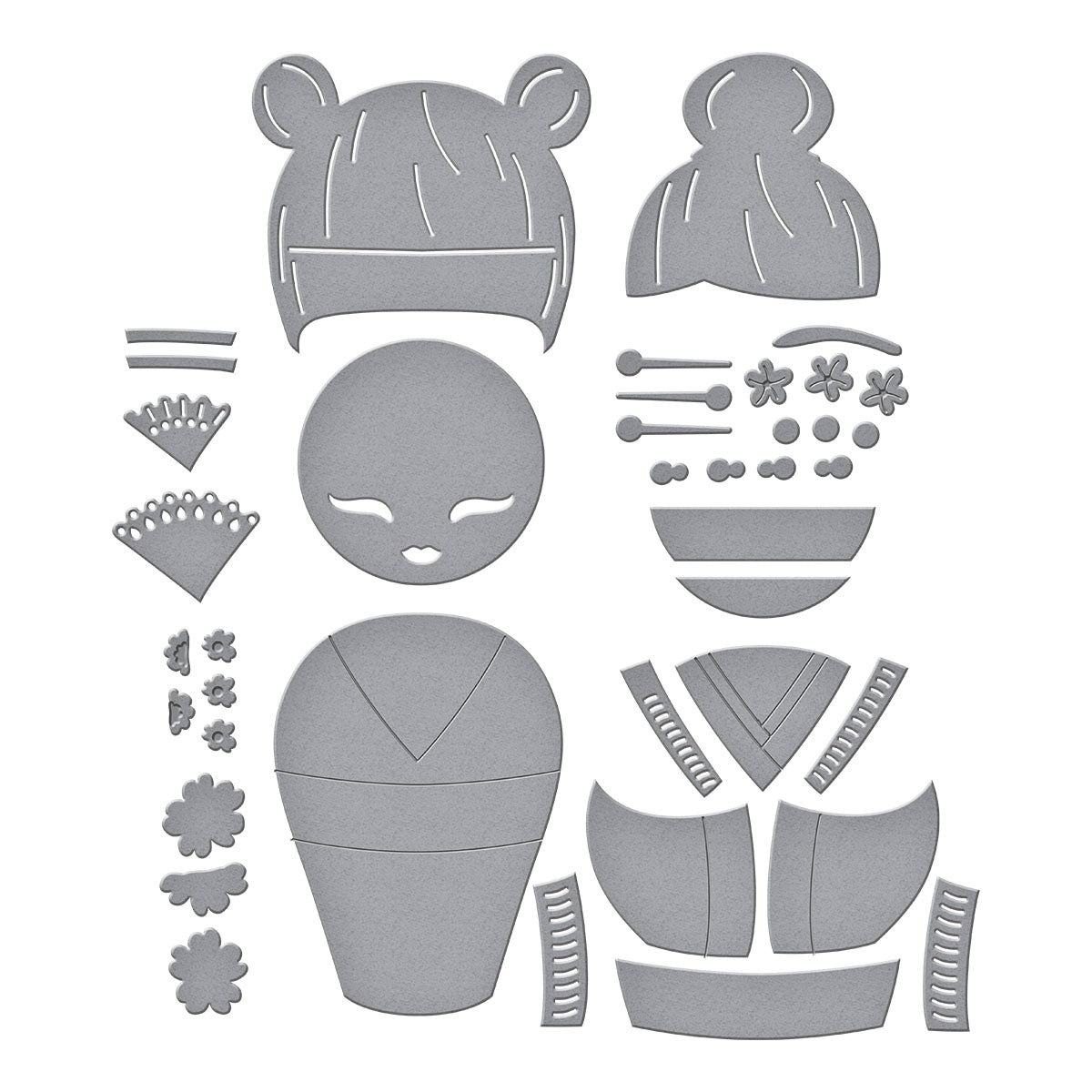 Kokeshi Dolls Etched Dies are from the Spring in Kyoto Collection by Alex Syberia Designs. Assembled, this set of 17 thin metal cutting dies make two designs of a wooden Kokeshi Doll. One has a single bun hair style and another has double buns. Accessories include a fan, flowers and a variety of hair décor for lots of ways to personalize the doll. The finished doll with double buns measures approximately 1.85 x 3.65 in./4.70 x 9.30 cm and the doll with a single bun measures 1.75 x 3.90 in./4.40 x 9.90 cm.